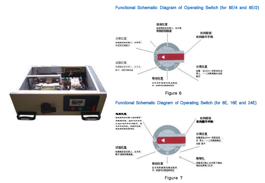 ① The bottom of the drawer must be correctly inserted into the guides before being pushed into the cabinet; otherwise, problems such as drawer damage or inability to pull it out may occur.② The symbol marks and functions on the panel of 8E/4 and 8E/2 drawers are shown in Figure 6. The arrow from the open position "O" to the operating position "1" in the figure indicates the following operation: first push the operating handle inward, then rotate the handle from "O" to "1". When returning, no pushing is required—just rotate the handle from "1" to "O", and the handle will pop out automatically after being released.③ The symbol marks and functions on the panel of 8E-24E drawers are shown in Figure 7. When the handle reaches the operating position "", the mechanism releases the mechanical interlock of the main switch. At this time, the main switch can be closed or opened; however, after the main switch is opened or closed, the handle of the interlocking mechanism cannot be operated.