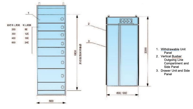 The basic cabinet frame of this product series adopts a modular assembled structure. All structural components of the cabinet frame are connected to each other by screw fastening to form a basic frame. Then, parts such as doors, baffles, partitions, drawers, mounting brackets, as well as busbars and electrical components are added as needed to assemble a complete switchgear cabinet. This cabinet has the following features: